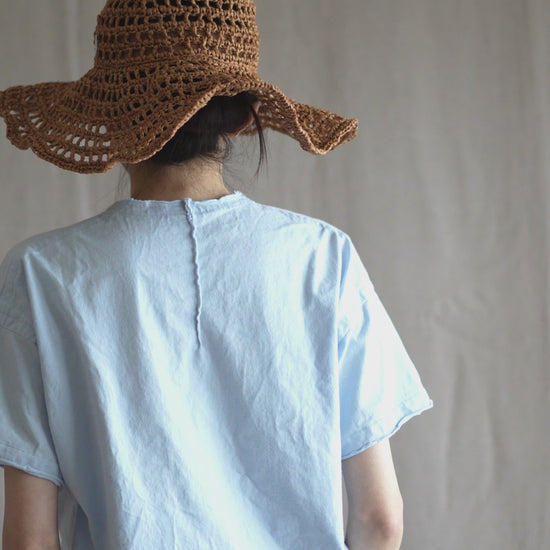 衿ぐり、袖口、裾を断ち切りにし、ヴィンテージのような雰囲気を出しています。