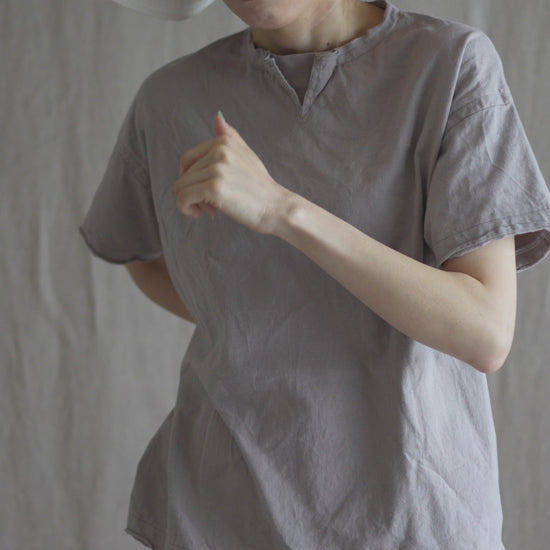 衿ぐり、袖口、裾を断ち切りにし、ヴィンテージのような雰囲気を出しています。