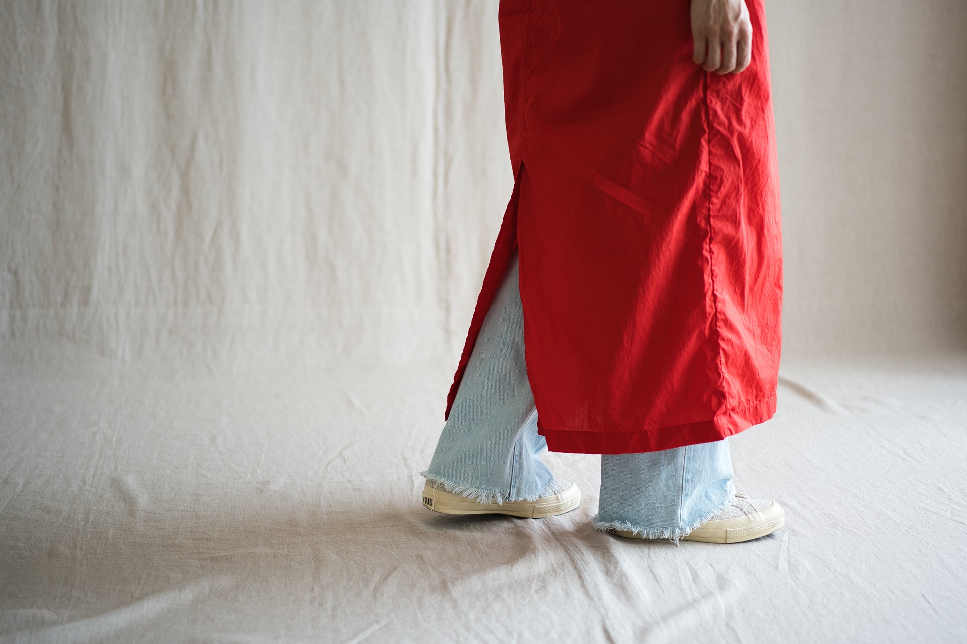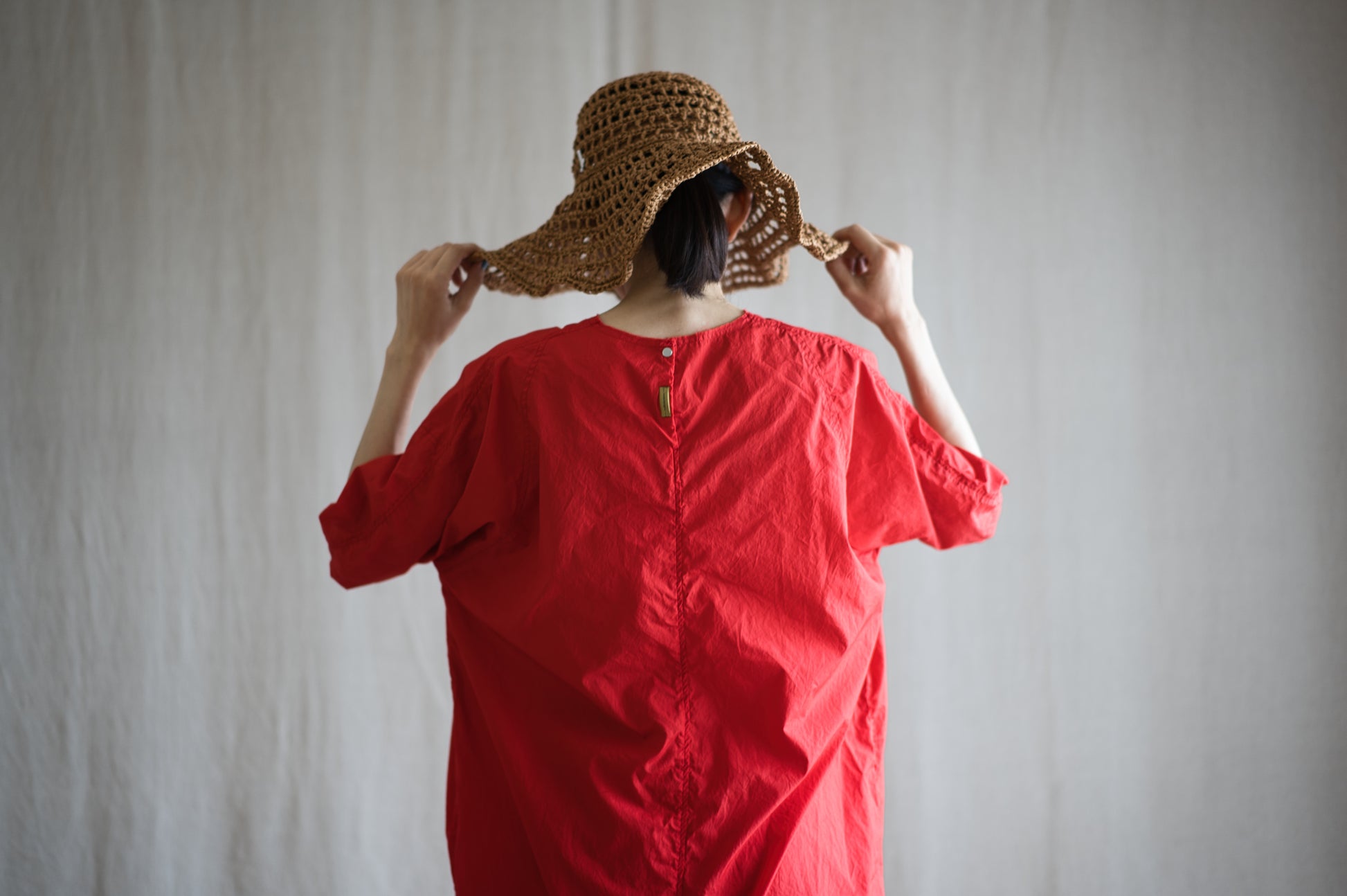 オーバーサイズで仕上げたワンピースは、体と洋服との間に適度に距離が出来、涼しげで軽やかな印象です。衿ぐりはカットオフ仕様です。粗野なデザインで、夏のムードたっぷりです。センターバックにスリットを入れ、足回りは快適です。