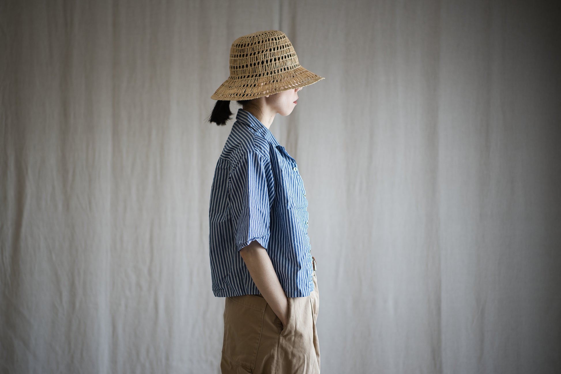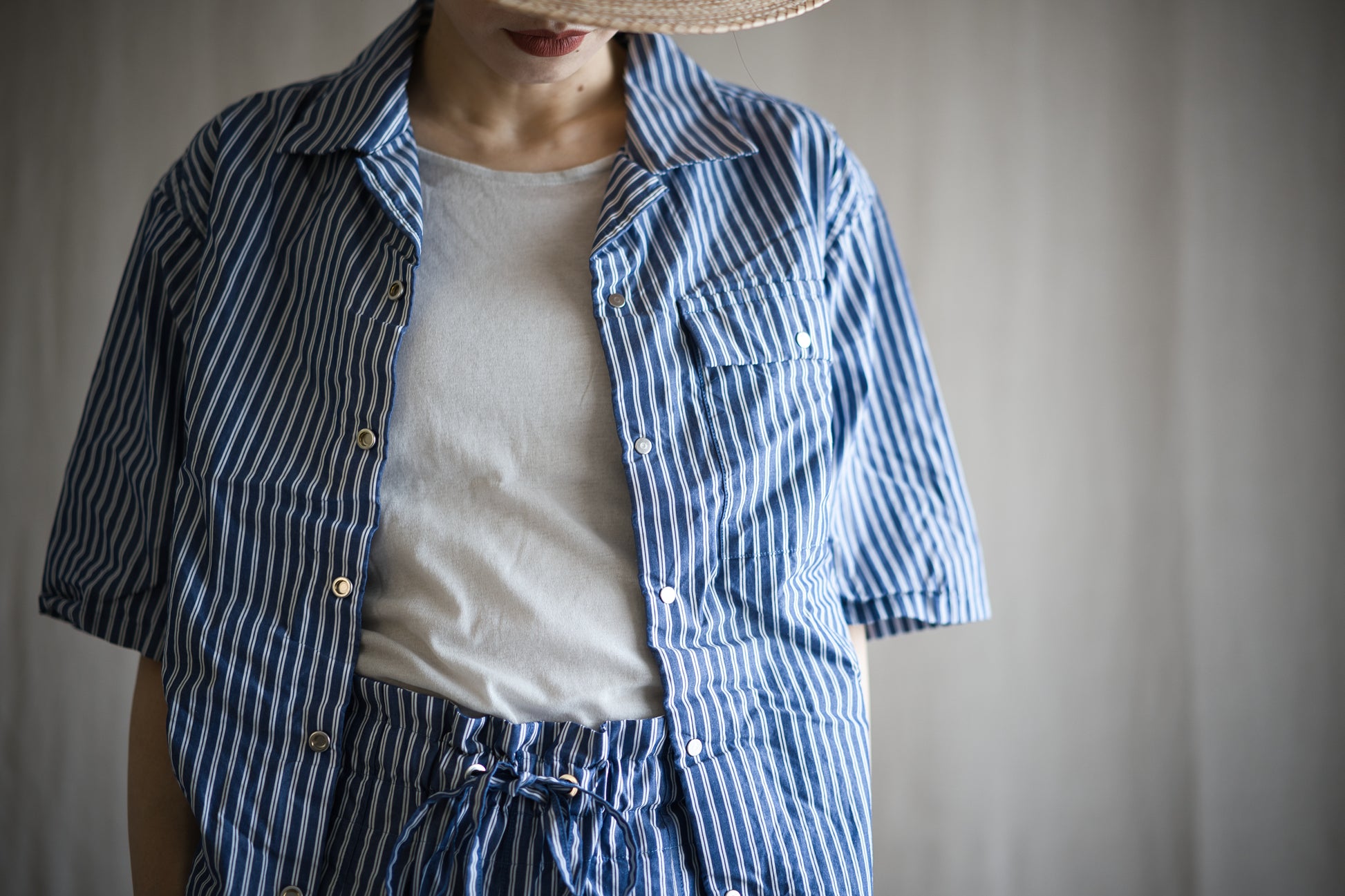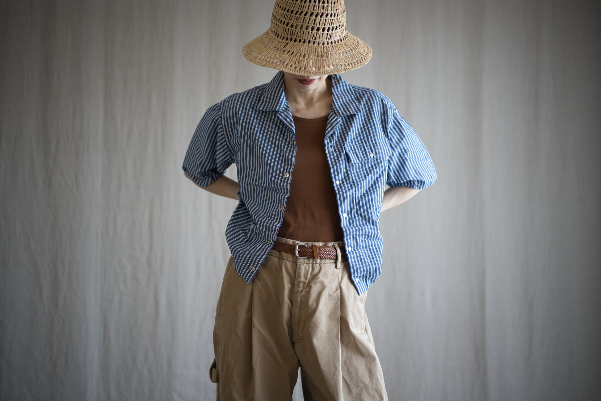 半袖開襟シャツは、ゆるく着用できるリラックスフィットで、クロップド丈と少し長めの半袖が印象的なバランスです。シャツのボタン部分には、ブラインドホックを採用しました。