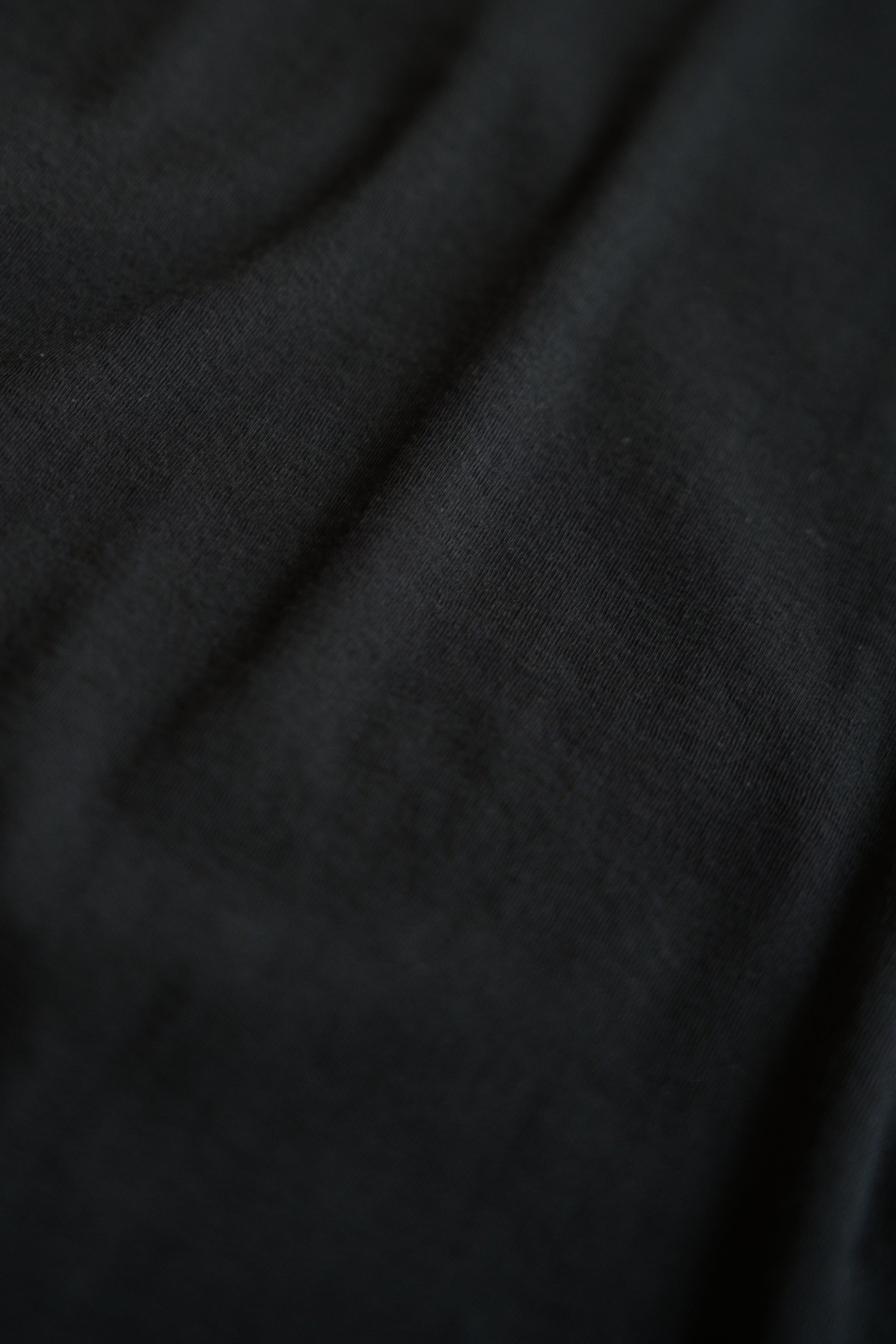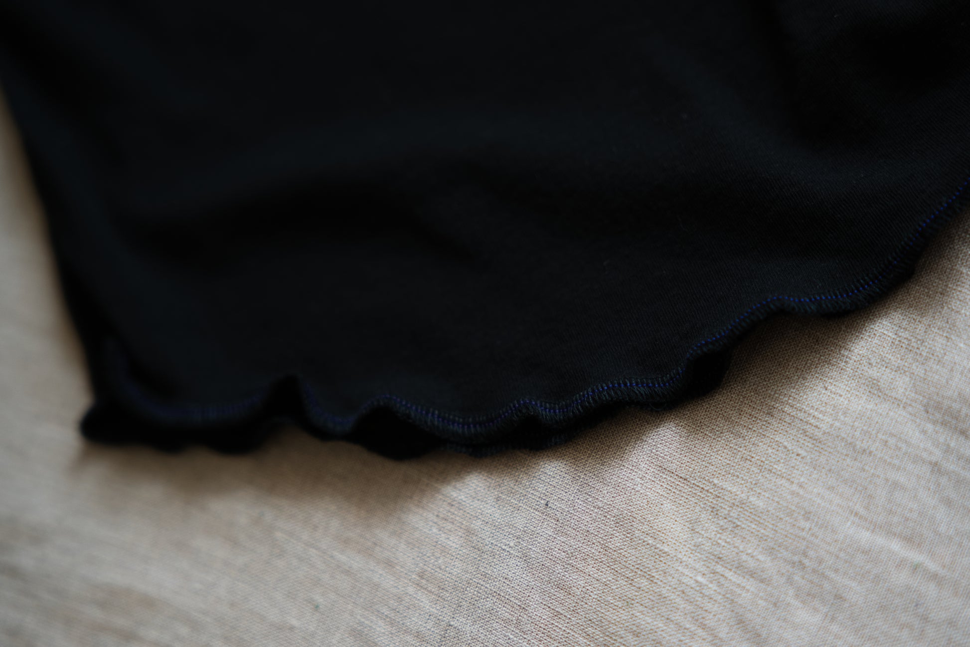 糸の製造段階で強い撚糸をかけることで、シャリ感のある春夏にぴったりな肌触りに仕上がりました。細かなリブ編で編んだカットソー生地は、ストレッチ性に富み、体を優しく包みます。