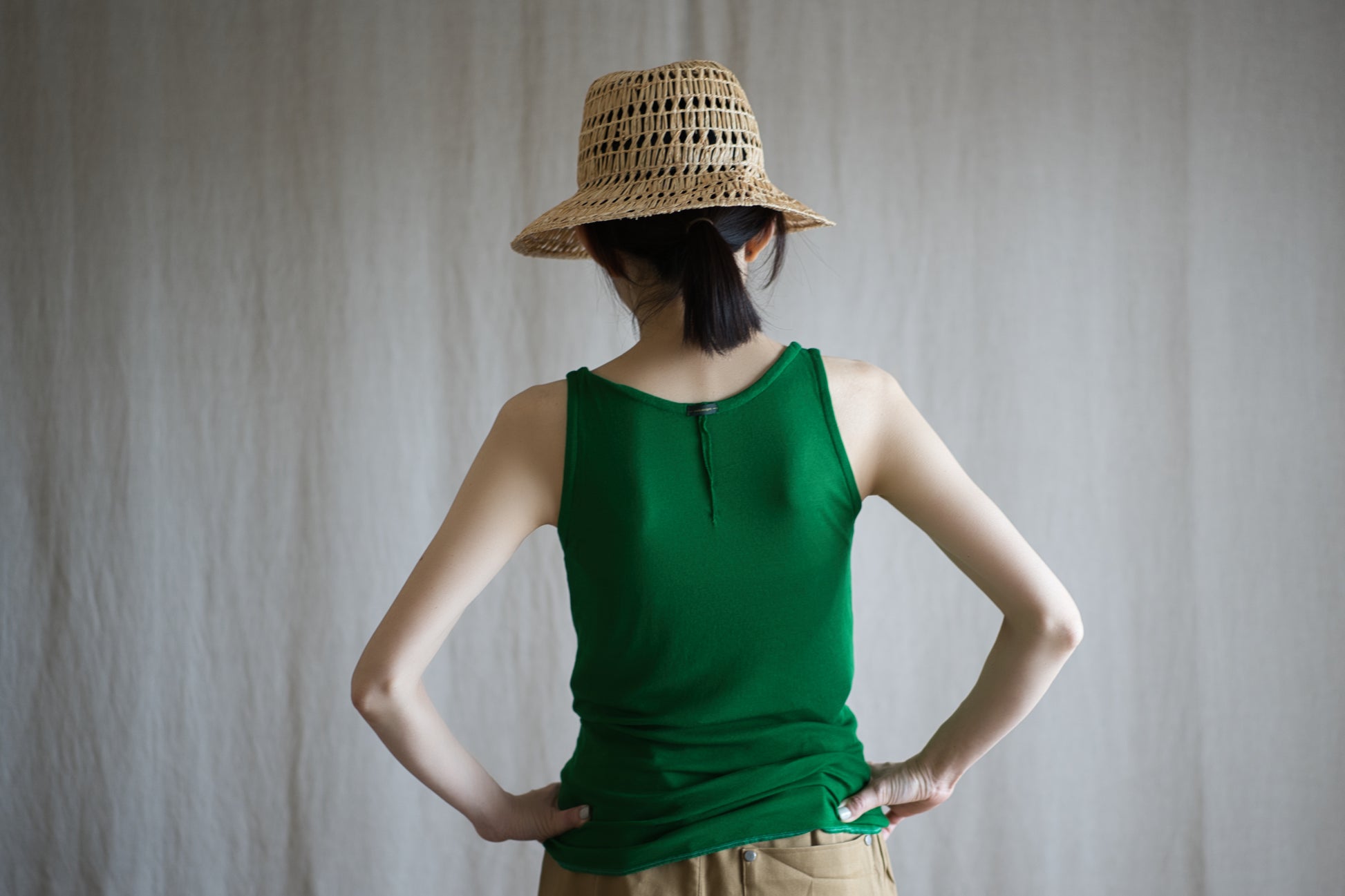 The yarn is twisted strongly at the manufacturing stage to give it a crisp feel that is perfect for spring and summer. The cut-and-sew fabric, knitted in a fine ribbed weave, is rich in stretch and gently wraps the body.