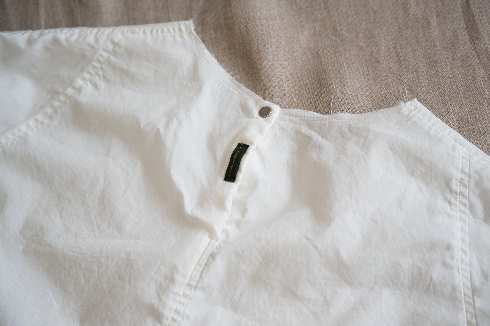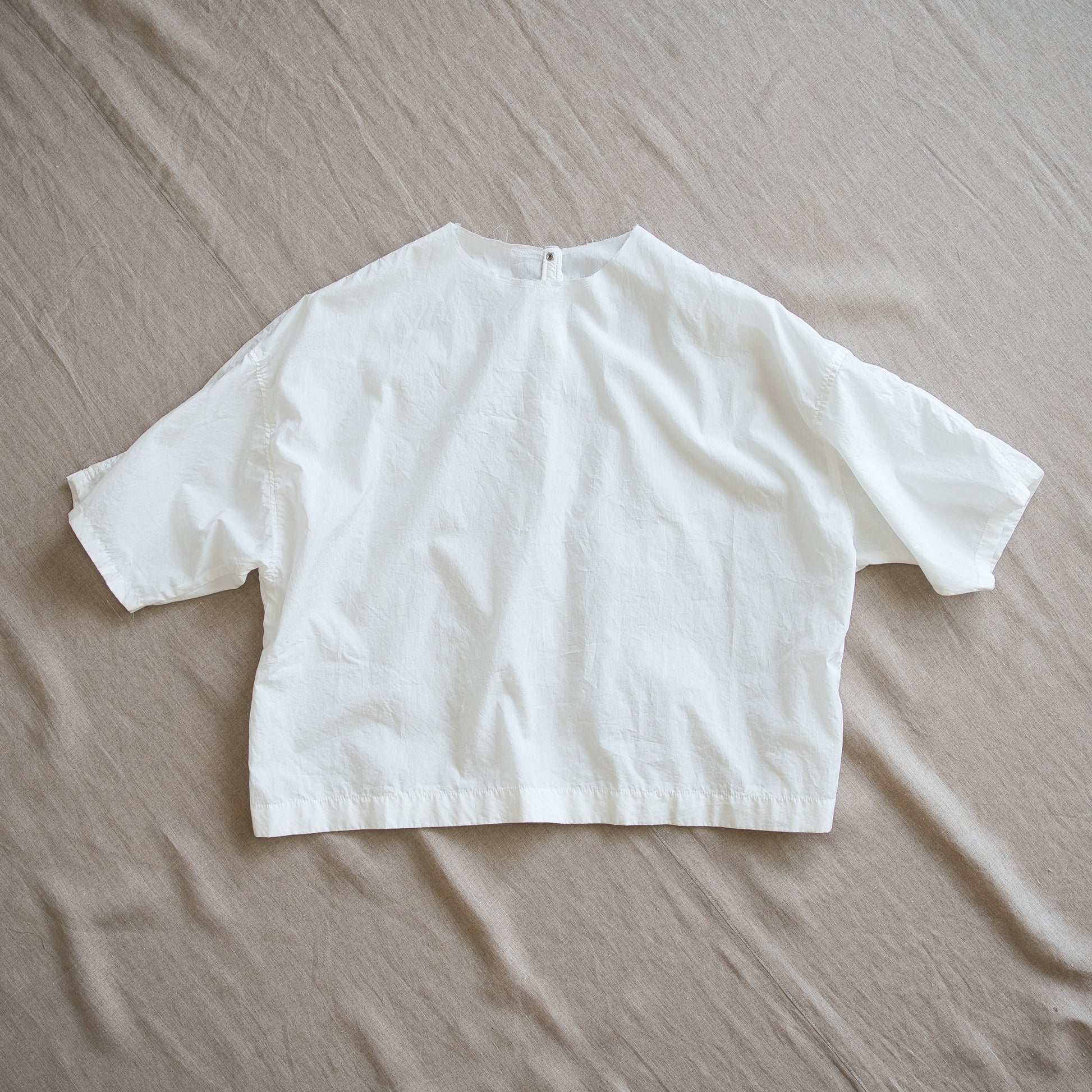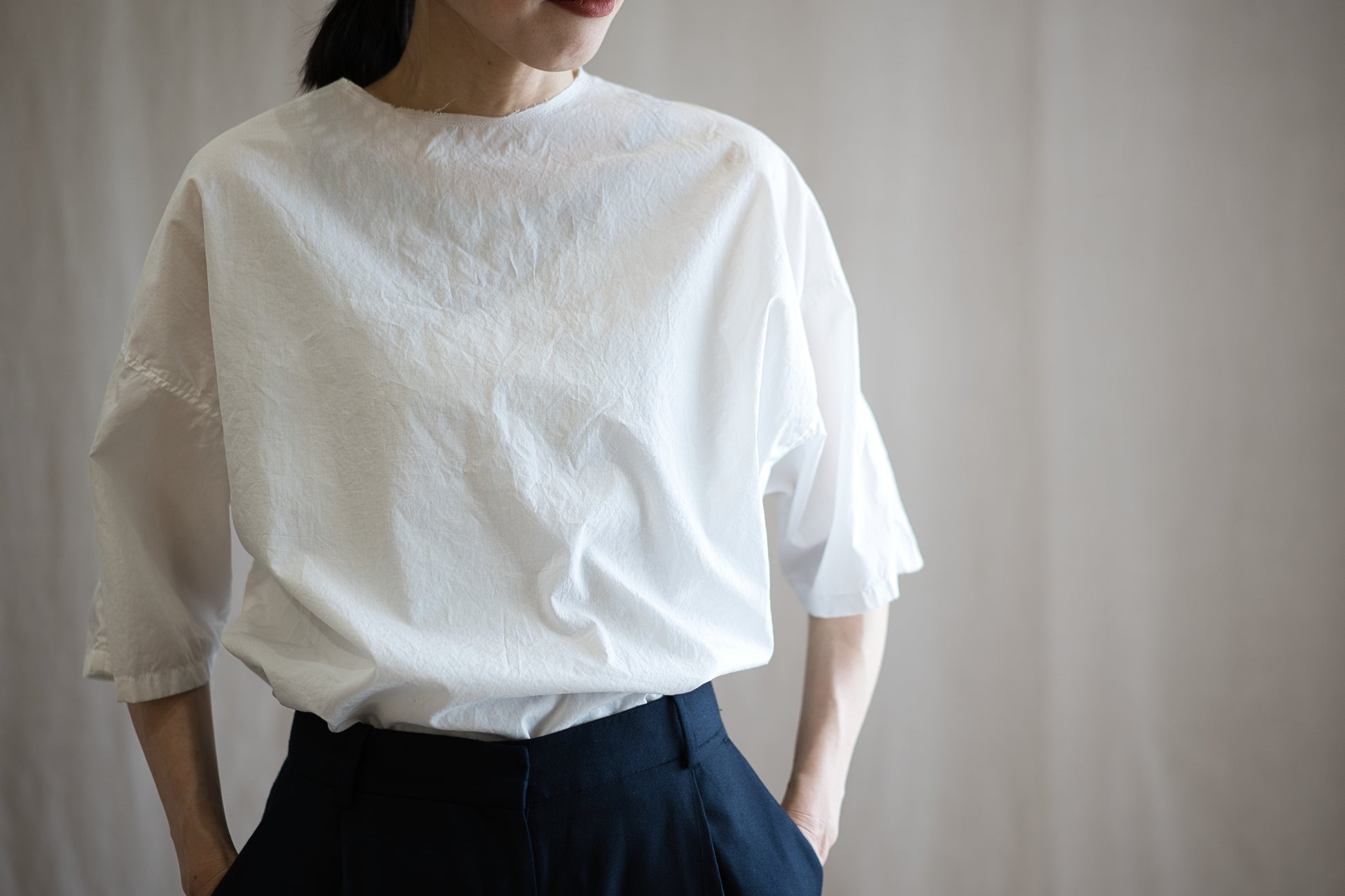 オーバーサイズで仕上げた織物のTシャツは、体と洋服との間に適度に距離が出来、涼しげで軽やかな印象です。衿ぐりはカットオフ仕様です。粗野なデザインで、夏のムードたっぷりです。
