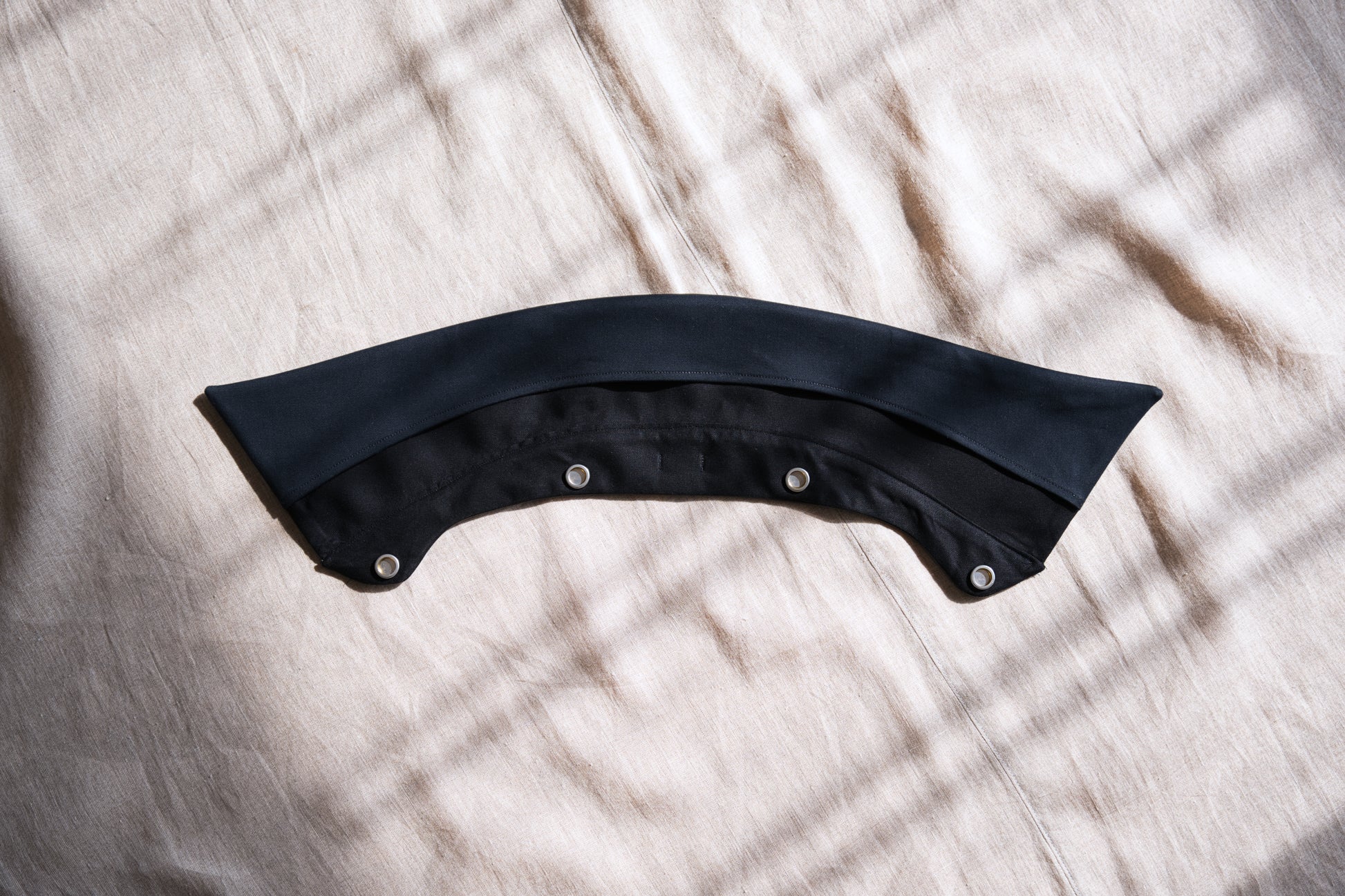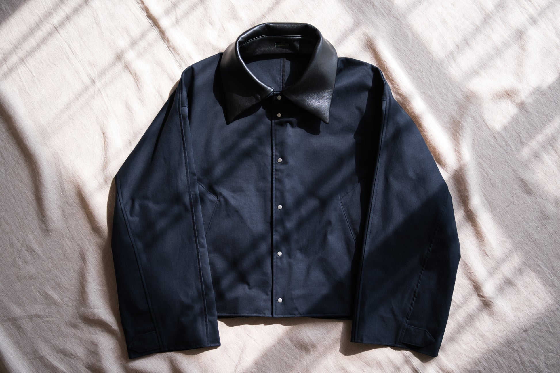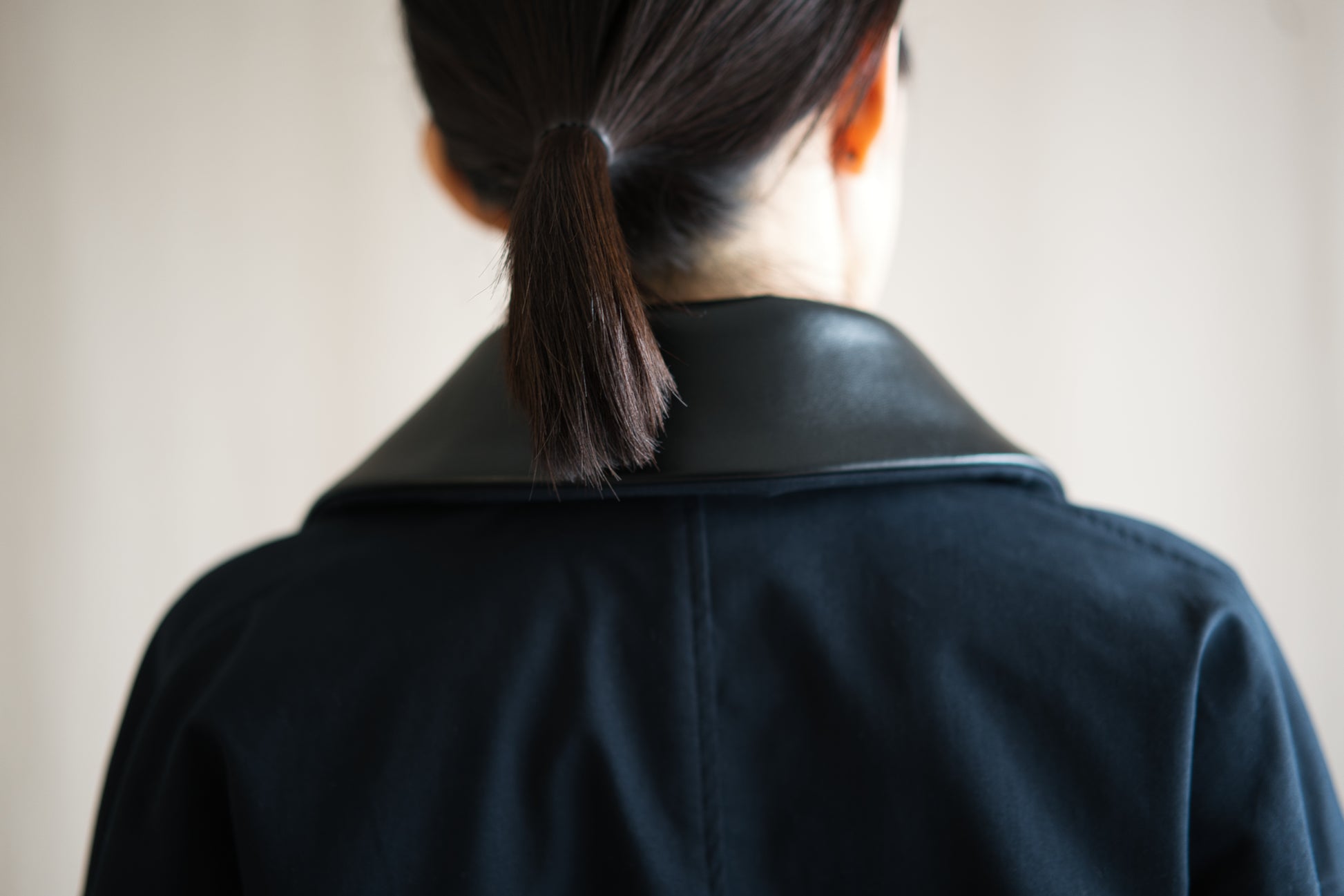 襟には、取り外し可能なラムレザーの衿を使用し、非常に高級感のありアイテムに仕上がりました。オーバーサイズのシルエットながら、丈は短めに設定したことですっきりした印象です。後身頃は、身頃と袖が一体になっており、優しく体になじむデザインです。