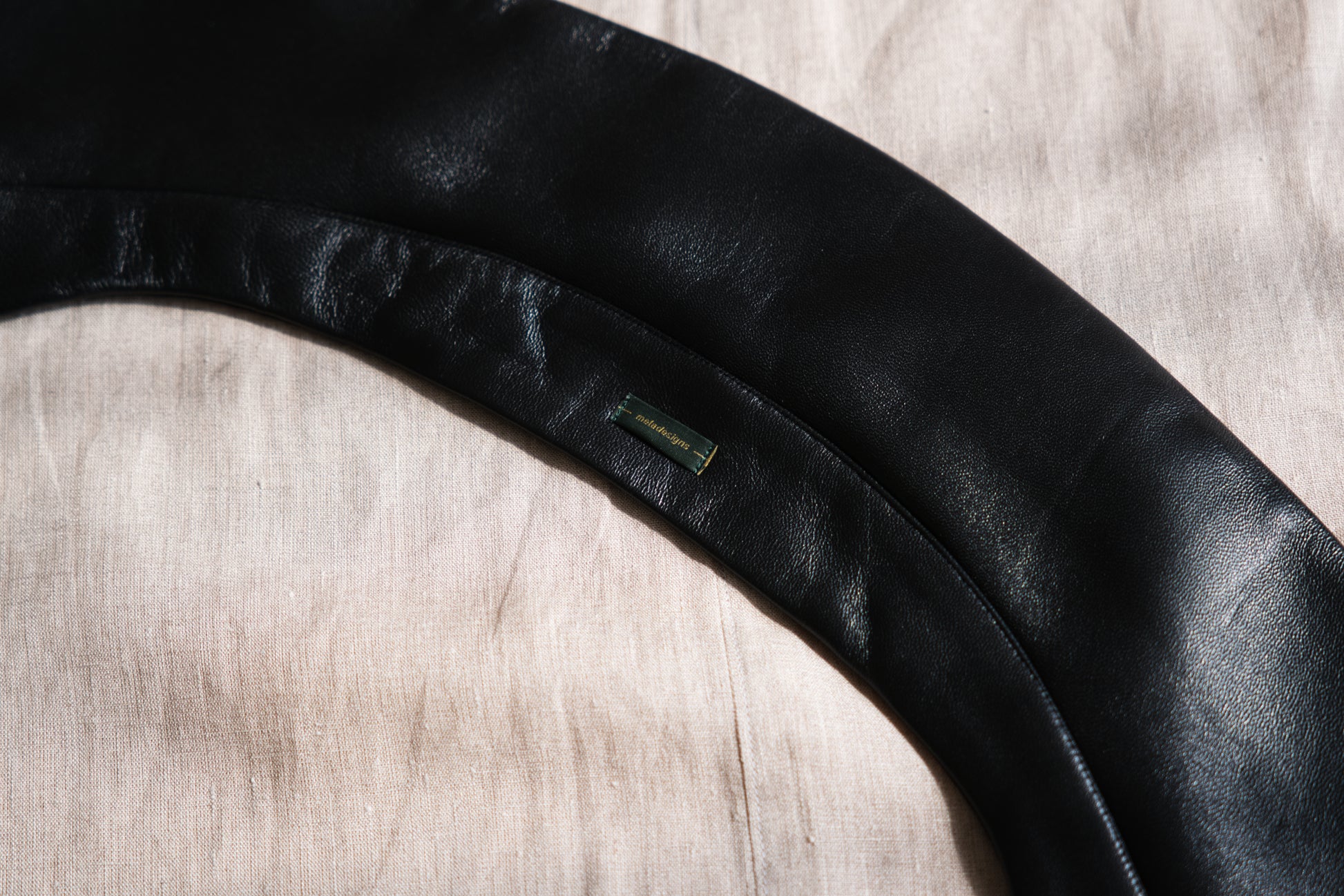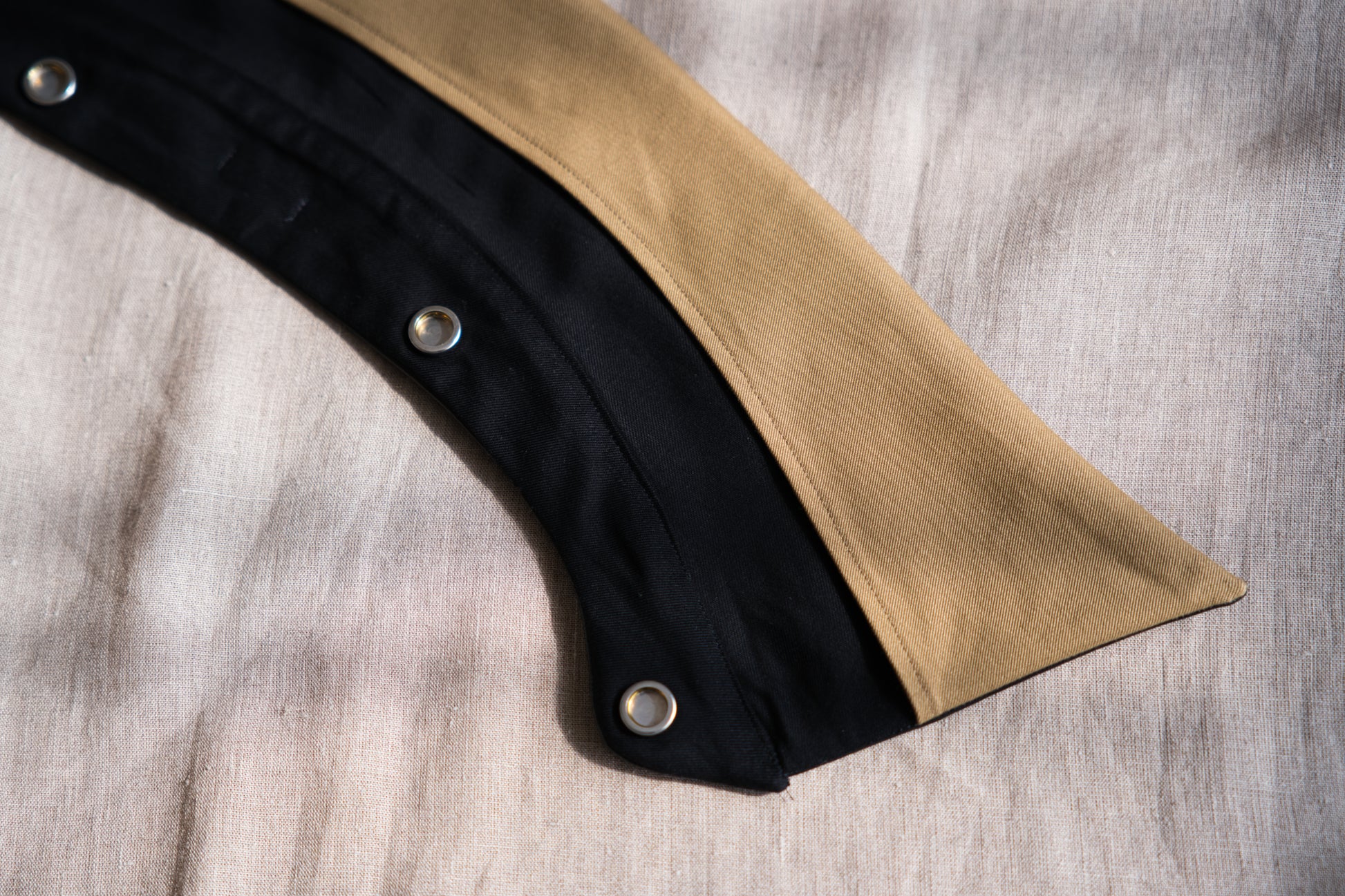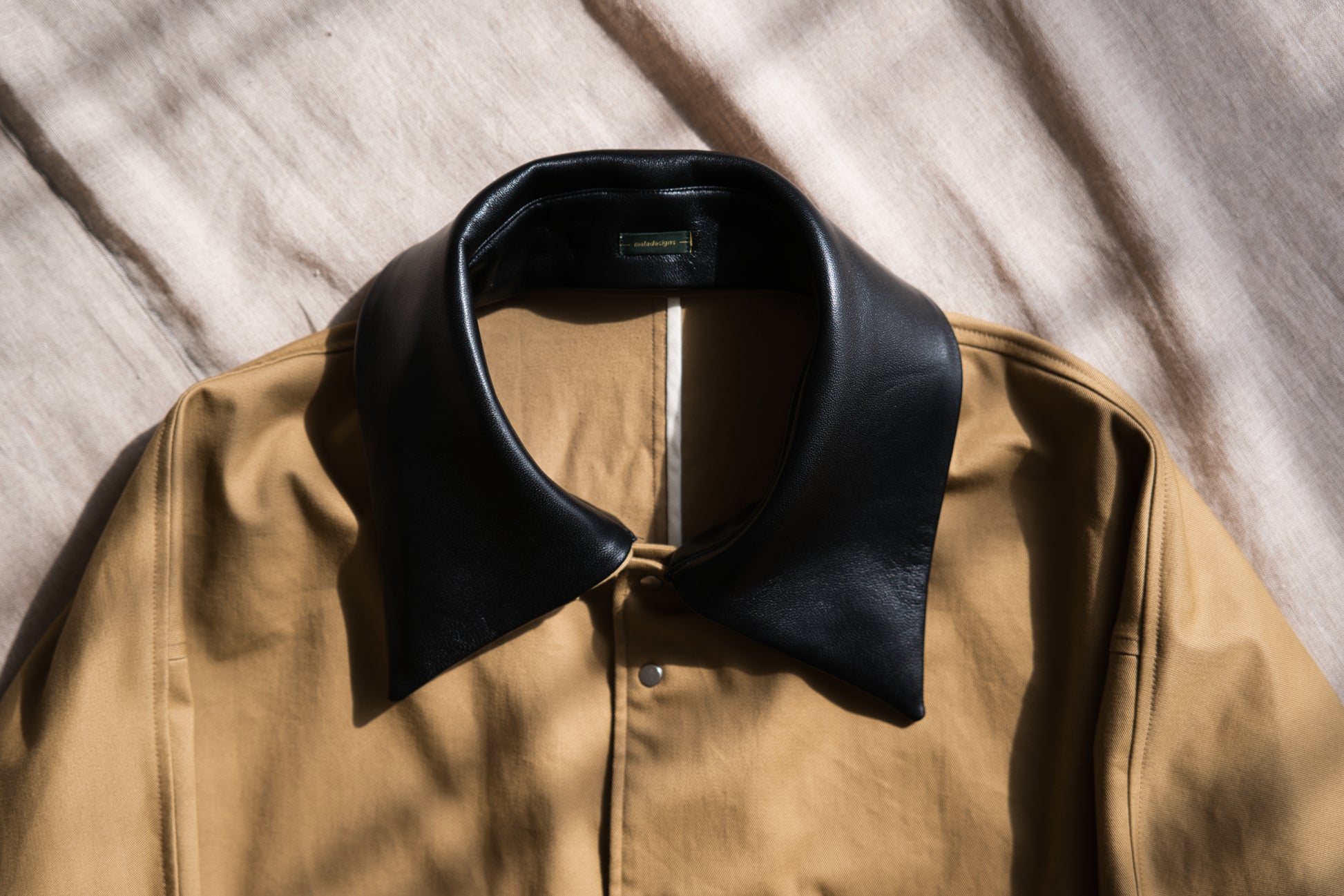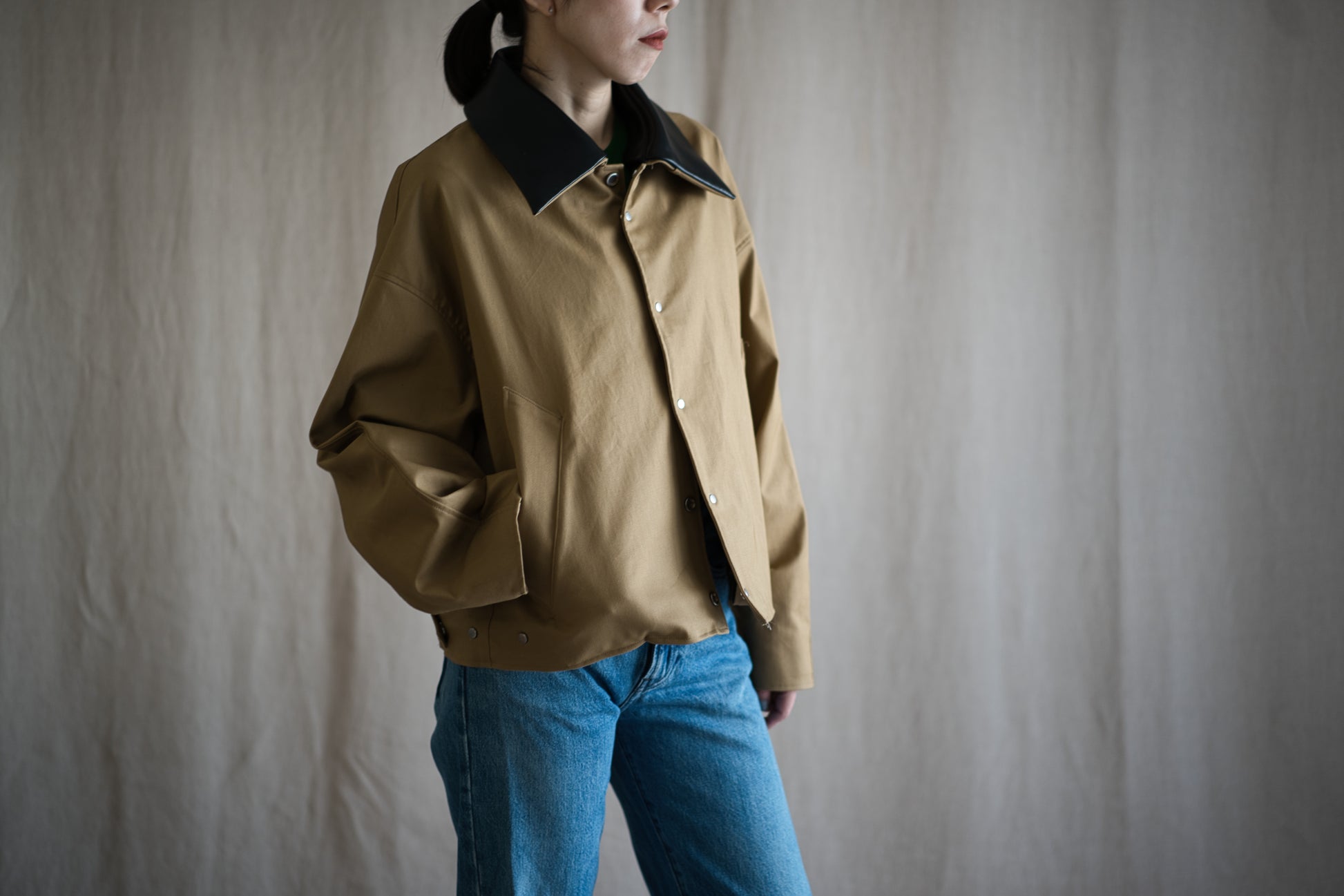 襟には、取り外し可能なラムレザーの衿を使用し、非常に高級感のありアイテムに仕上がりました。オーバーサイズのシルエットながら、丈は短めに設定したことですっきりした印象です。後身頃は、身頃と袖が一体になっており、優しく体になじむデザインです。