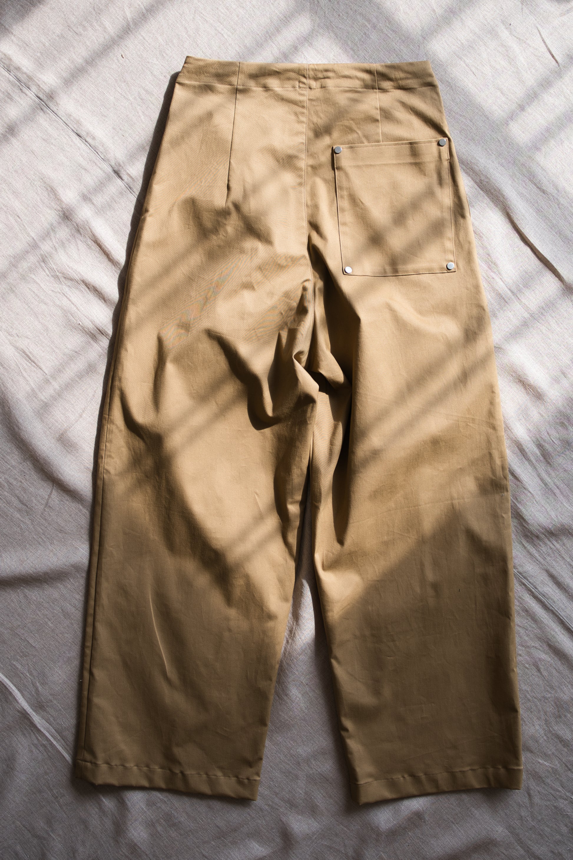These pleated pants are made from a fine-weave cotton twill fabric, perfect for early spring.