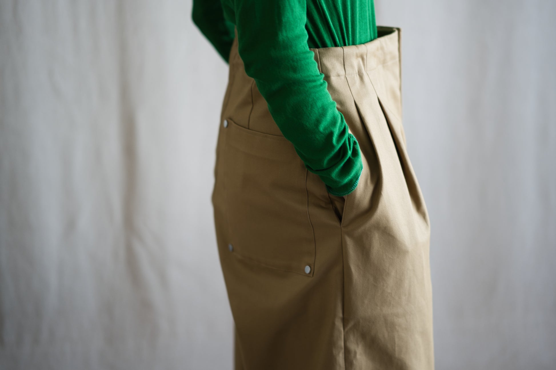 ワイドシルエットながら、腰回りはすっきり仕上げましたので、スタイル良く着用頂けます。ウエスト部分内側には紐を仕込んでおり、75㎝を最大にして、調節可能です。