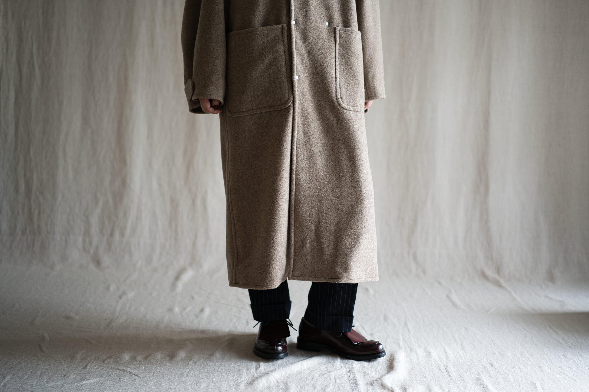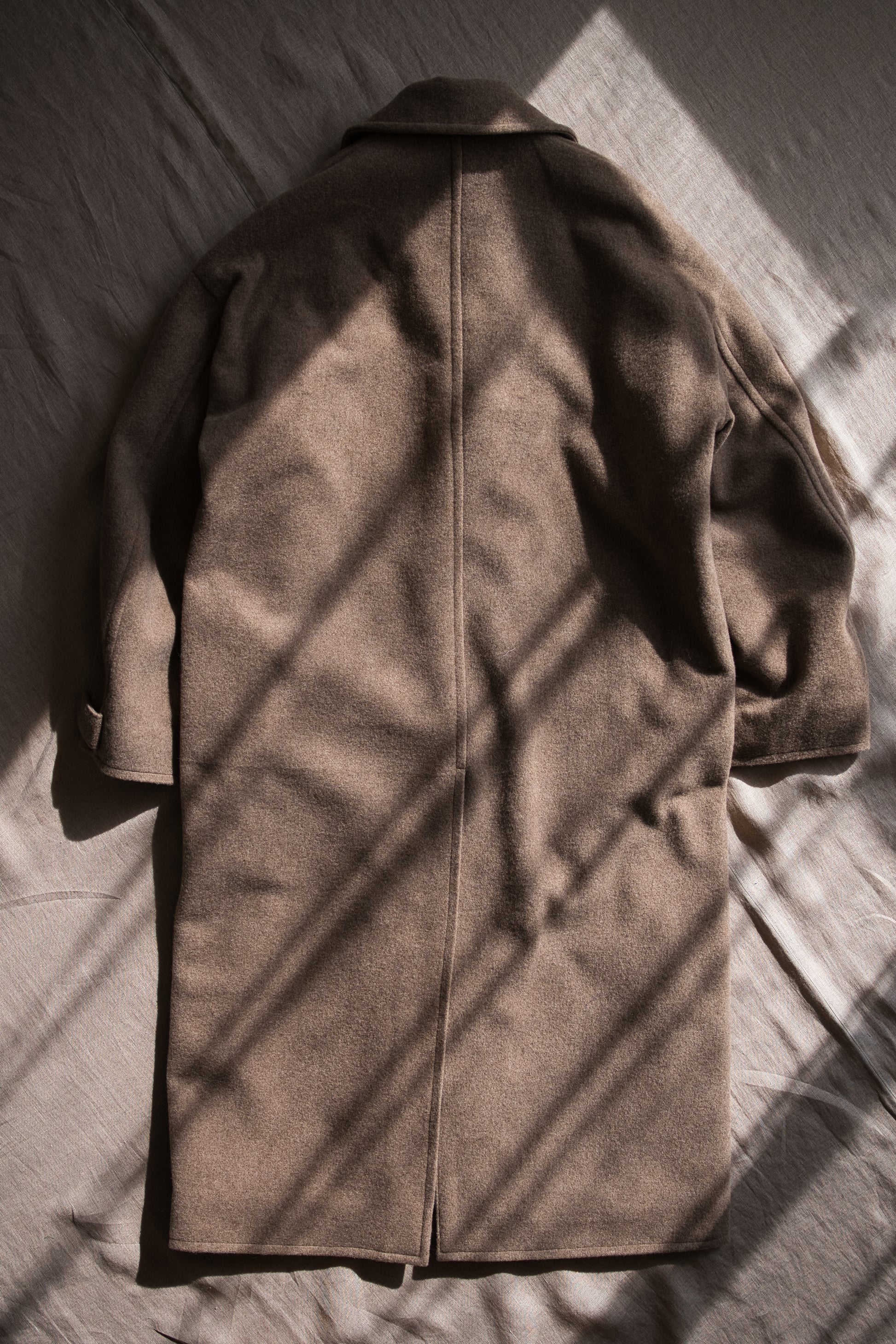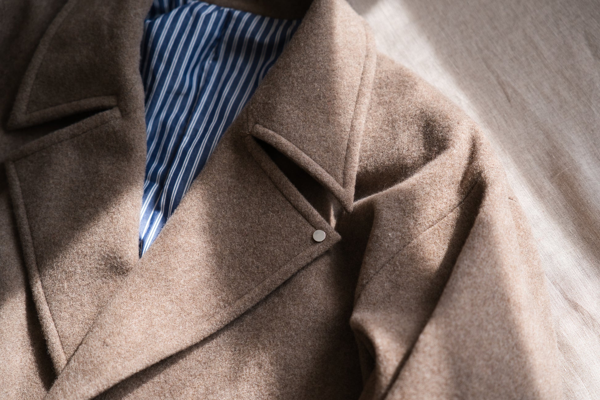 チェスターコートのラペルは、首元まで閉めることを可能にし、その日の寒さやコーディネートに合わせて遊んで頂けます。また、袖口にも調整可能なベルトをつけました。