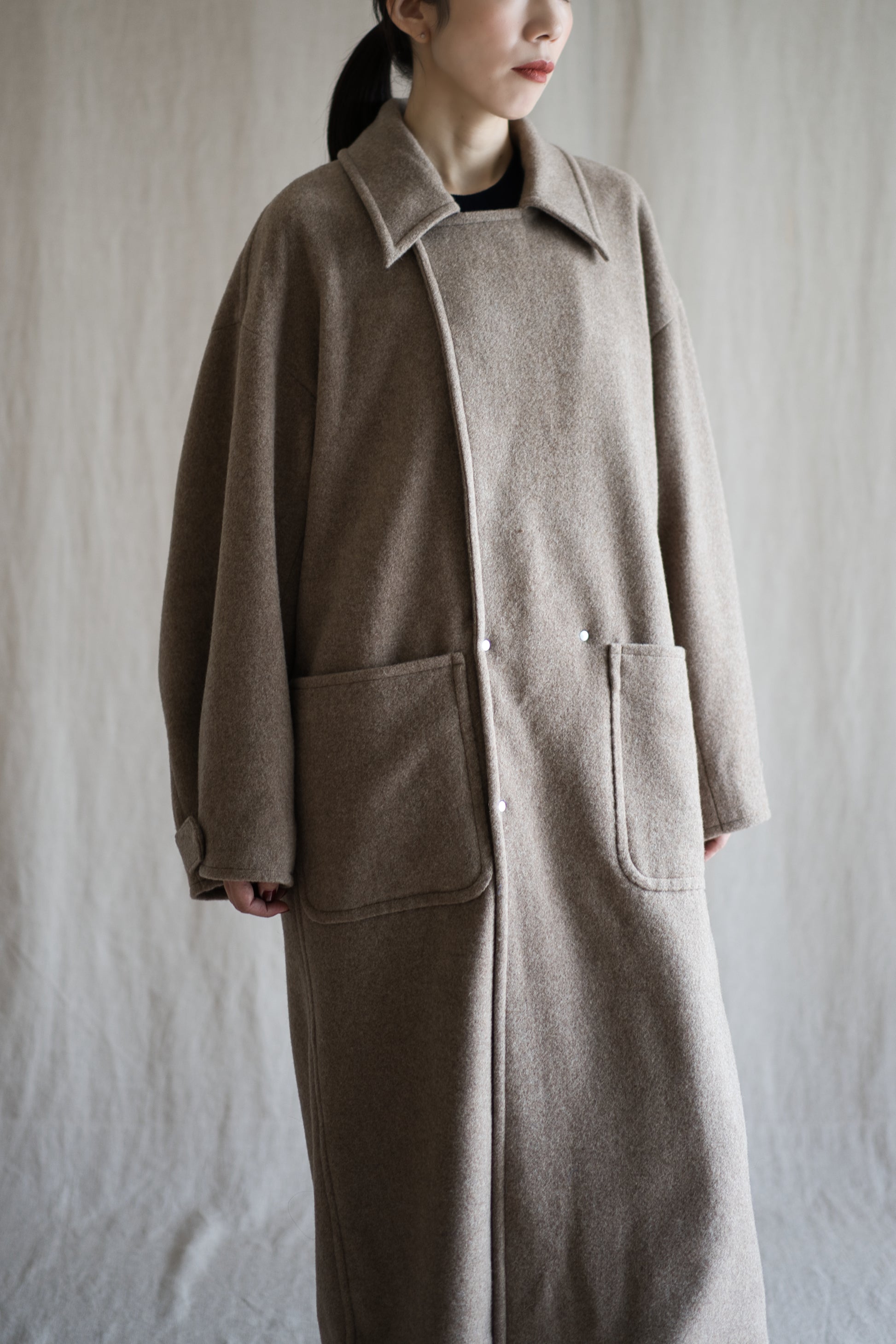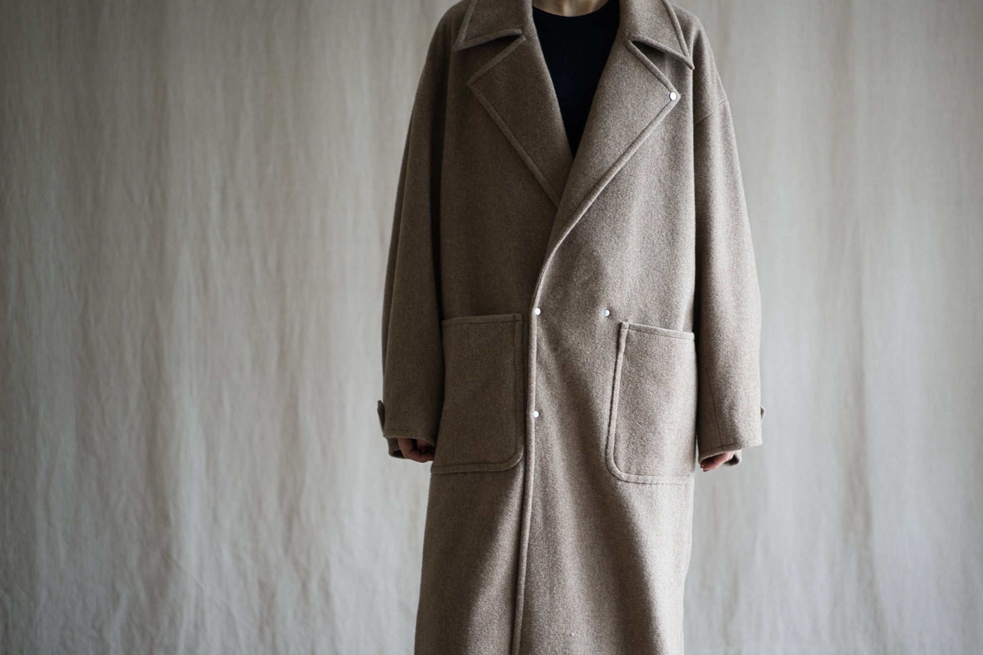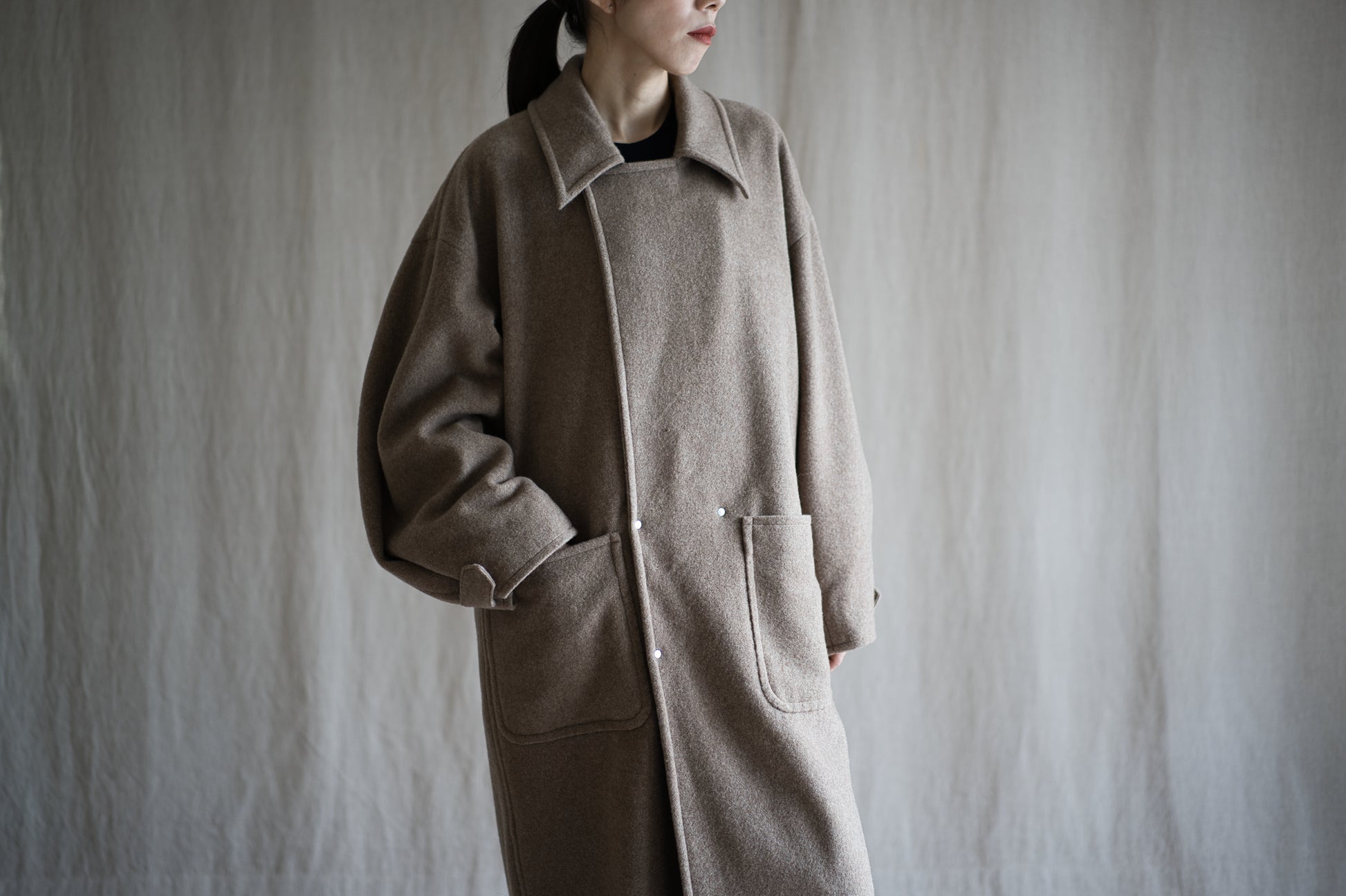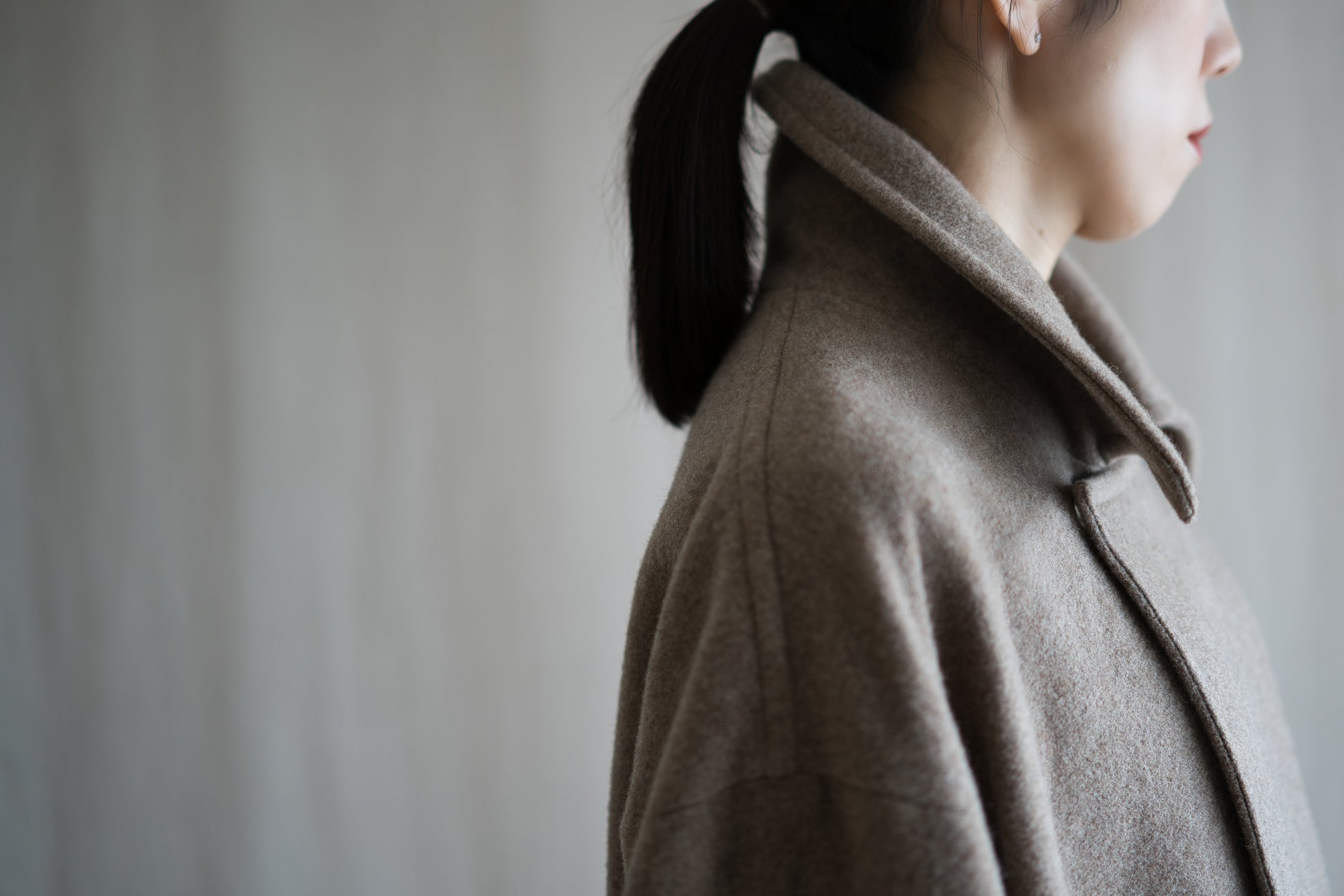 チェスターコートのラペルは、首元まで閉めることを可能にし、その日の寒さやコーディネートに合わせて遊んで頂けます。また、袖口にも調整可能なベルトをつけました。
