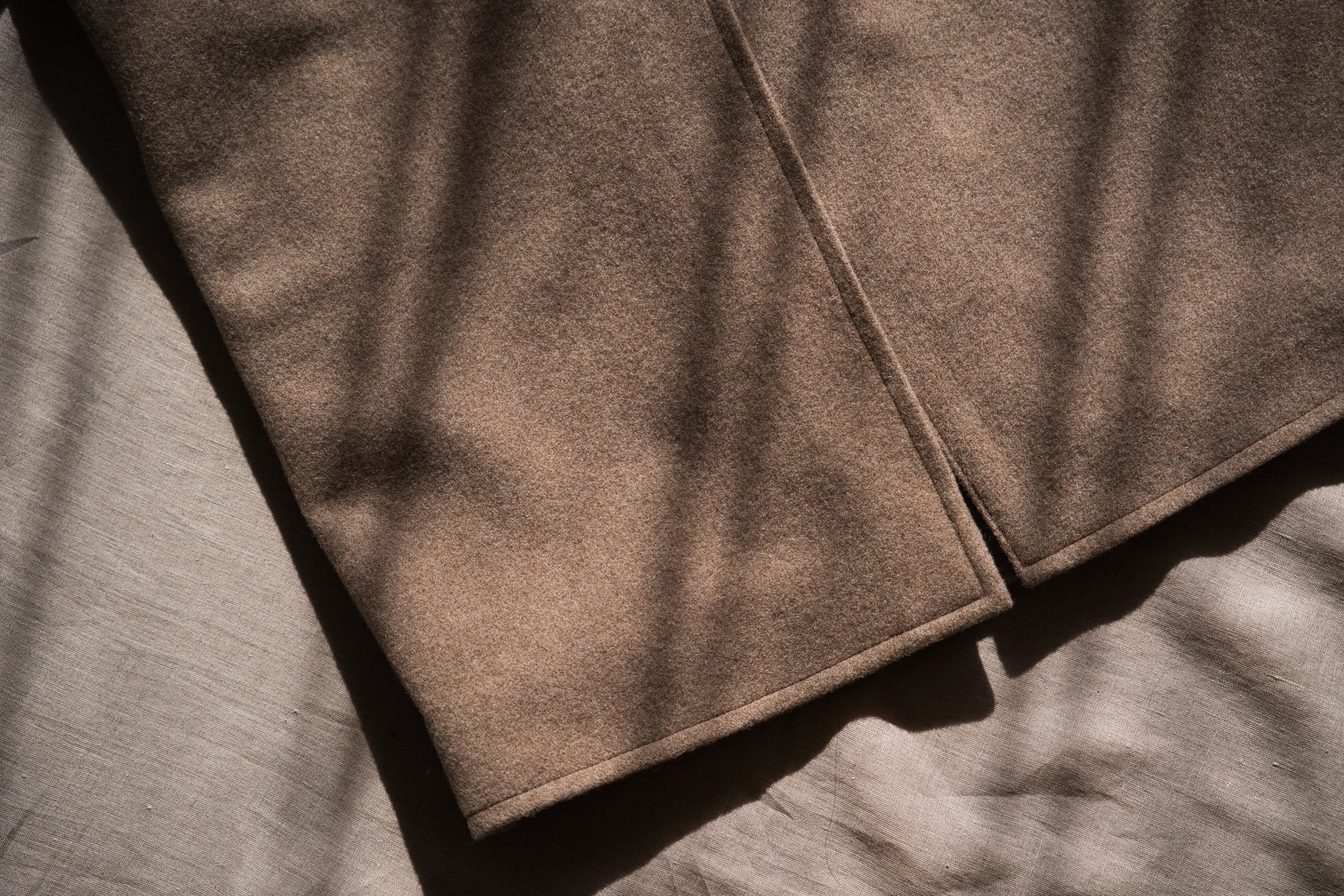太番手のウール糸をしっかり織り上げ、縮絨と起毛加工を施し、毛羽を綺麗に借り揃えた見た目が苔のような深みのある色になることからモスウールと名づけられました。