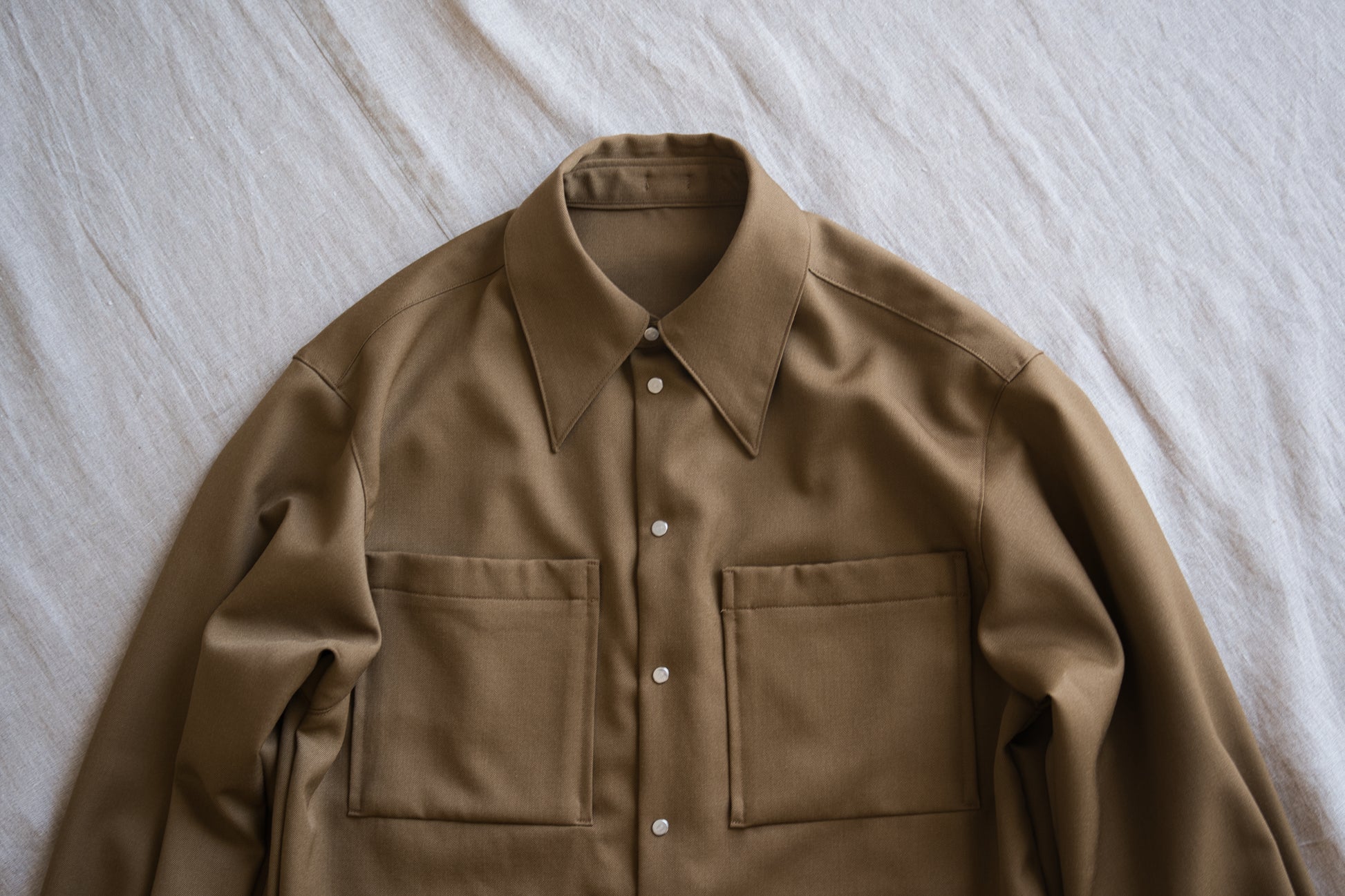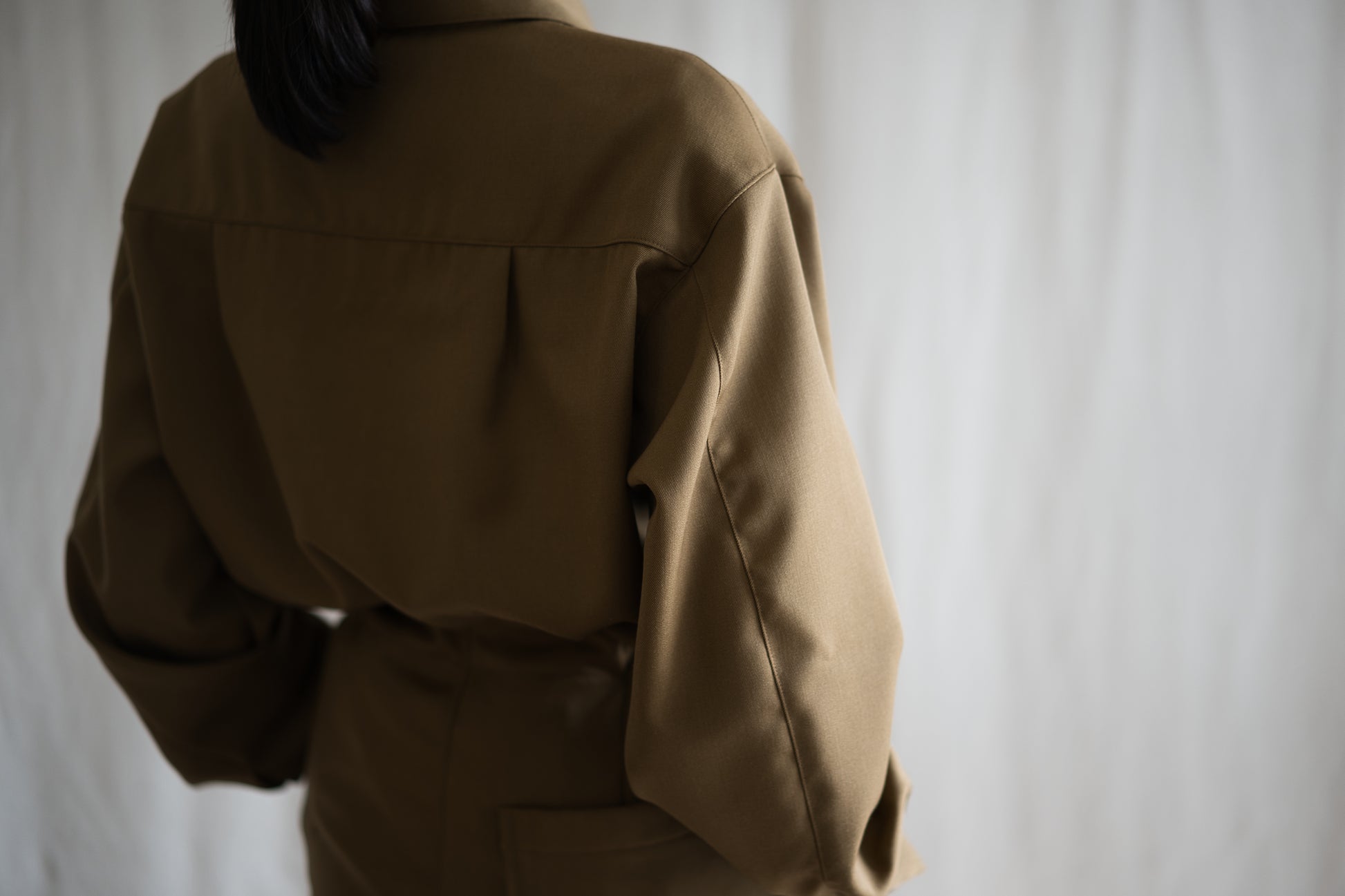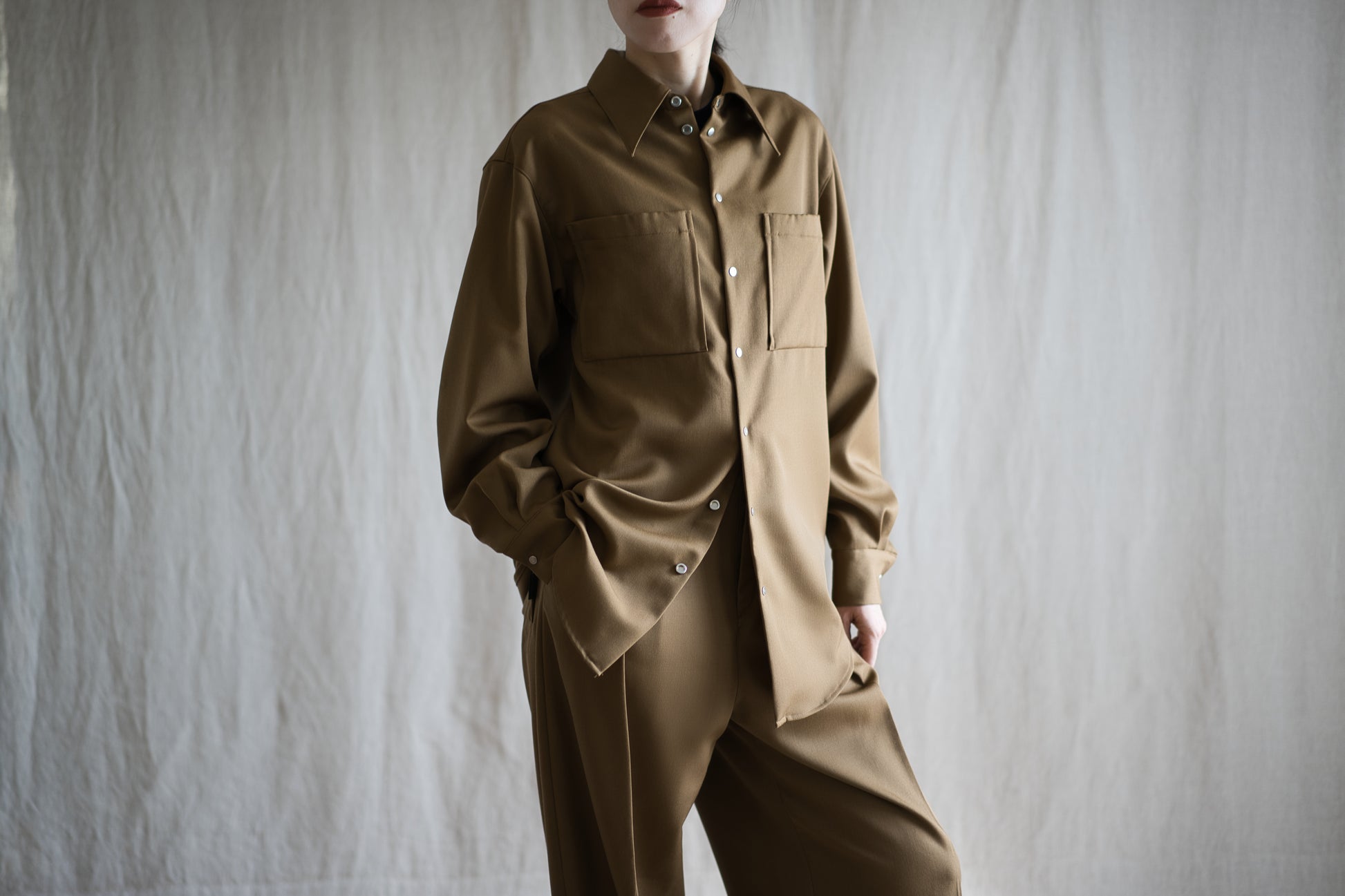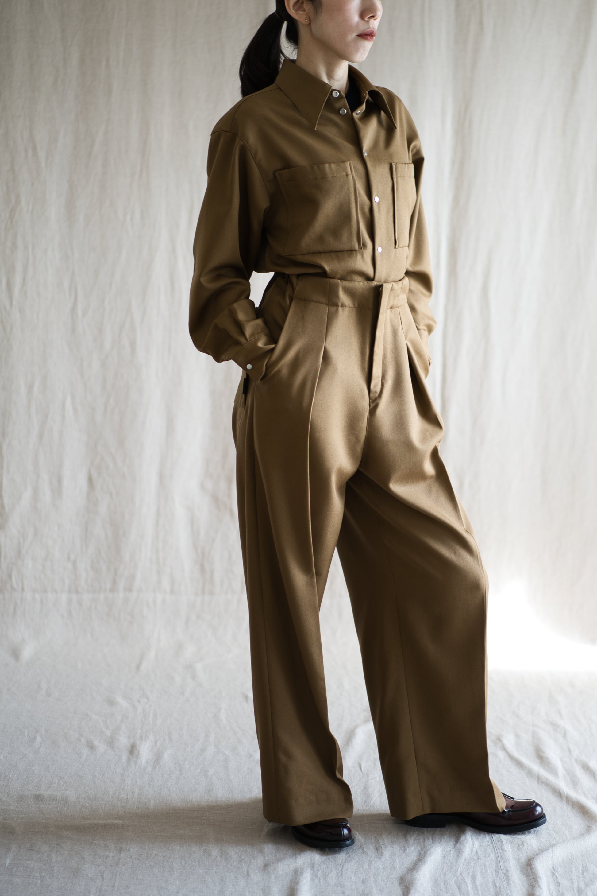 厳選されたウール原料をツイル織りにし、肉厚感を出した素材は、しわになりにくく、自然で上品は光沢感が特徴です。