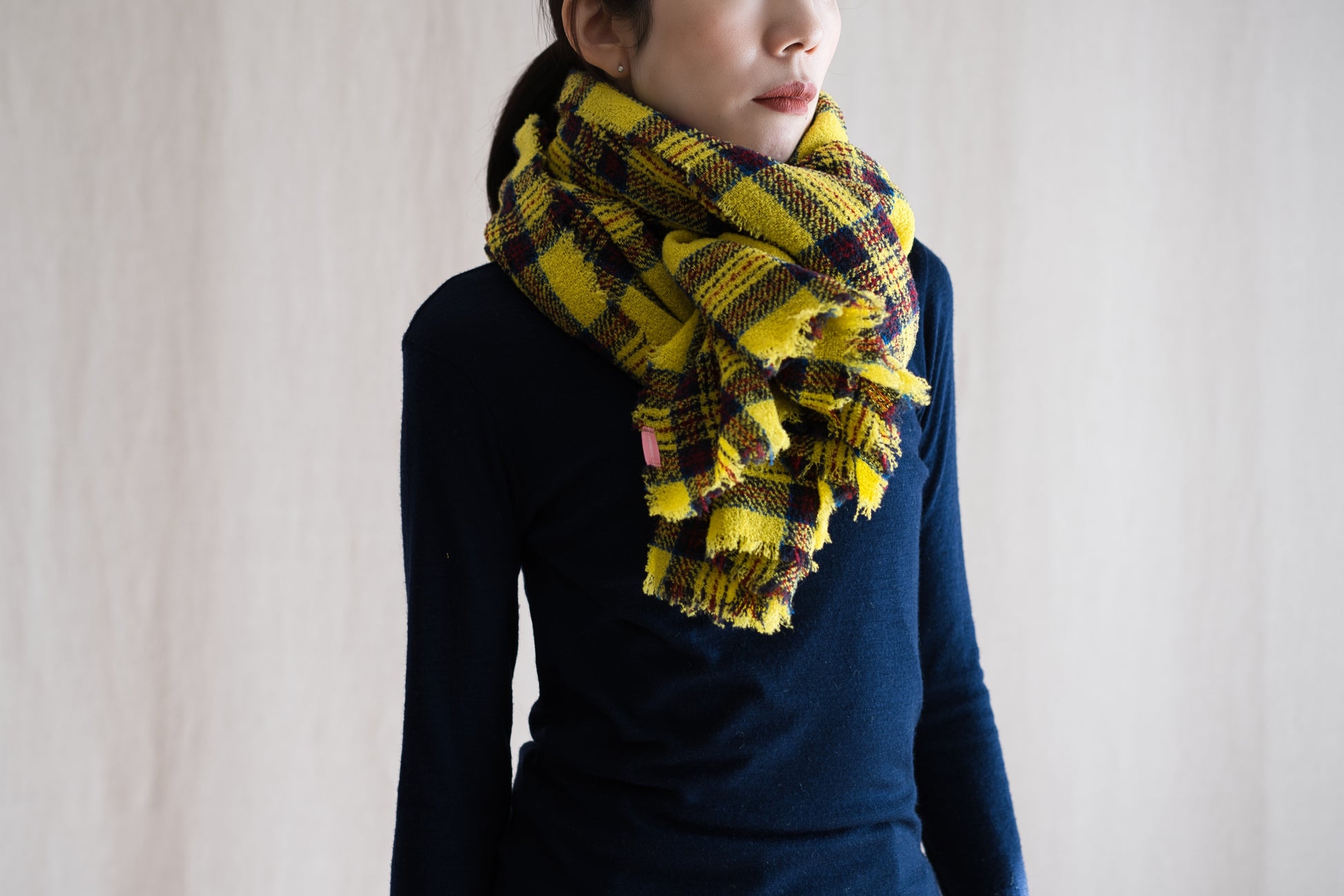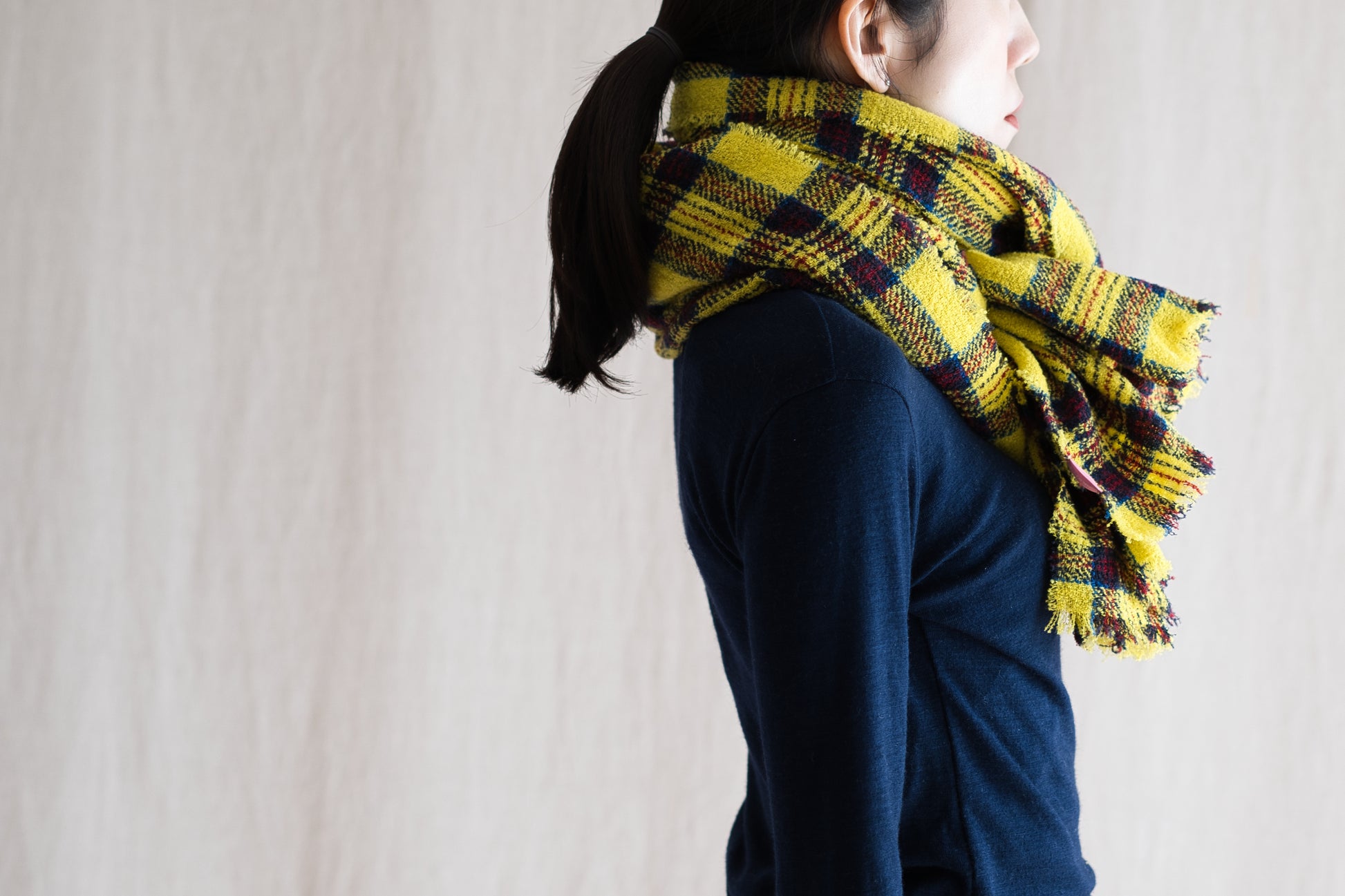 大柄のチェックで、濃淡のある色使いを使用することで非常にカラフルなストールに仕上がりました。。