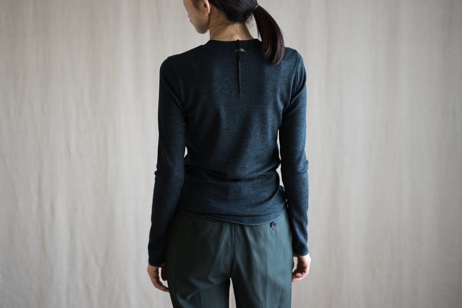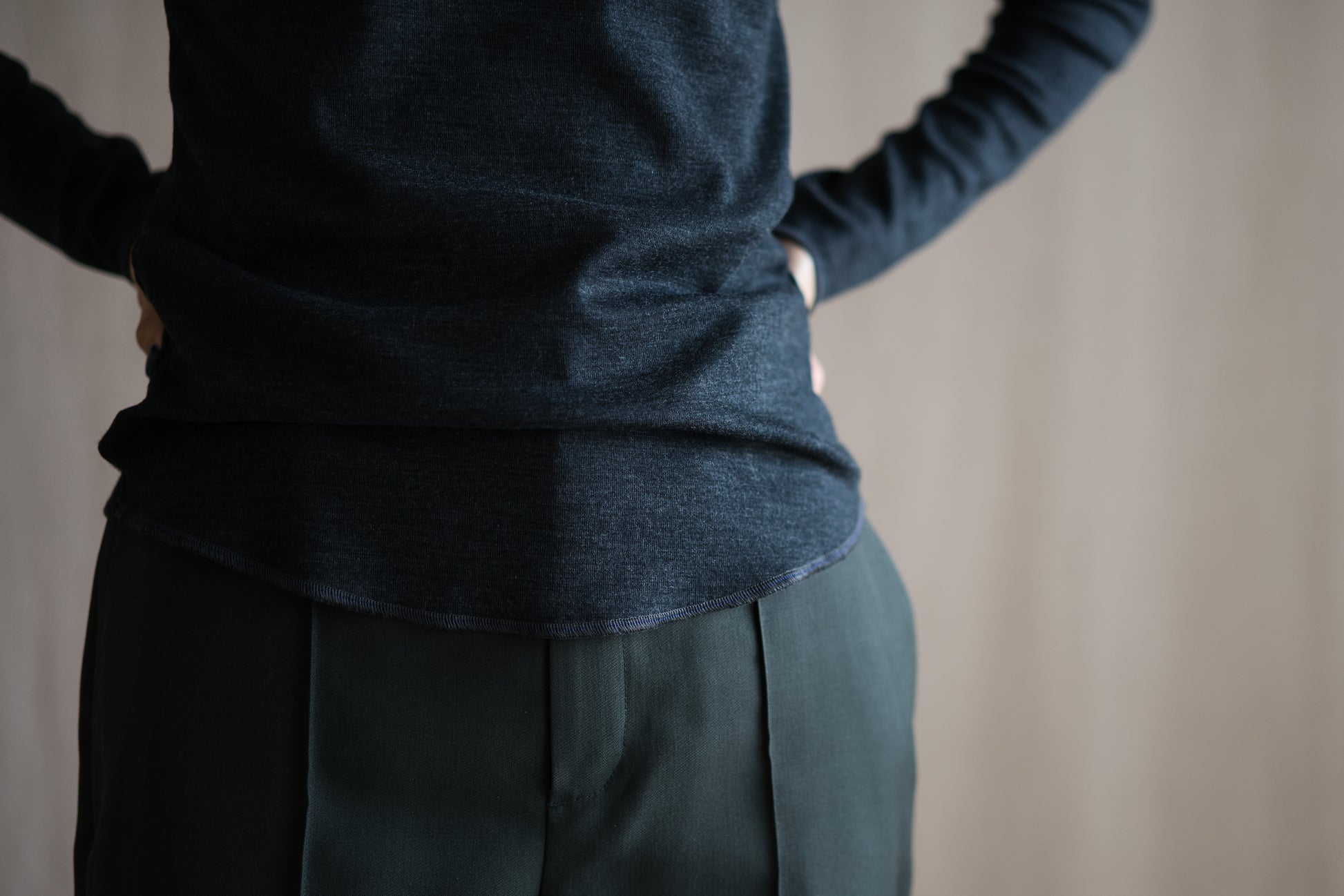 限られた細さを持つ原毛でしか作られない、選りすぐりの原料を用いたSUPER 100'S WOOLを贅沢に使用したトップスです。