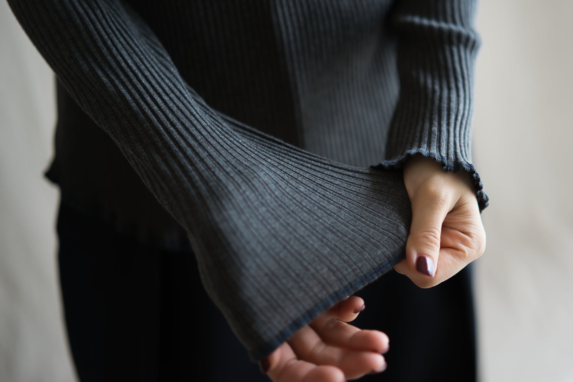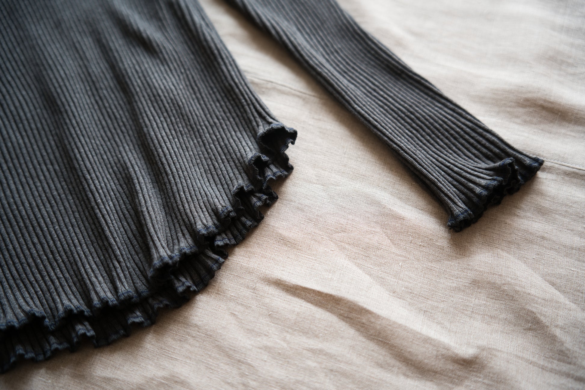 袖口と裾には、リブニットの伸縮性を生かしたフリルをあしらい、甘くなりすぎない大人のフリルに仕上がりました。